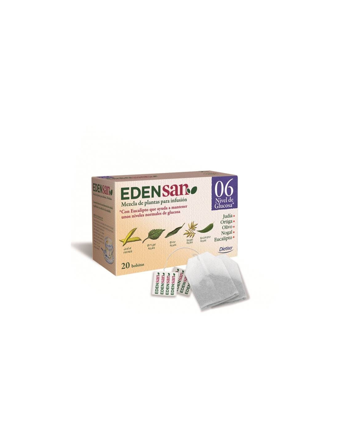 Phaseolus vulgaris L. (Judía) vainas 15% Se emplean sus vainas que contienen faseolina y cromo entre otros constituyentesUrtica dioica L. (Ortiga) 25% Sus hojas colaboran en las funciones de eliminación del organismoJuglans regia L. (Nogal) hojas 15% Sus largas hojas colaboran en la eliminación del exceso de líquidosOlea europea L. (Olivo) hojas 15% Sus hojas ayudan al balance fisiológico de azúcaresEucaliptus globulus Labill (Eucalipto) hojas 8% Sus aromáticas hojas ayudan a mantener unos niveles de glucosa normalesMalva sylvestris L. (Malva) flores 2% Sus flores son emolientes y aportan frescura a la mezclaModo de empleo: