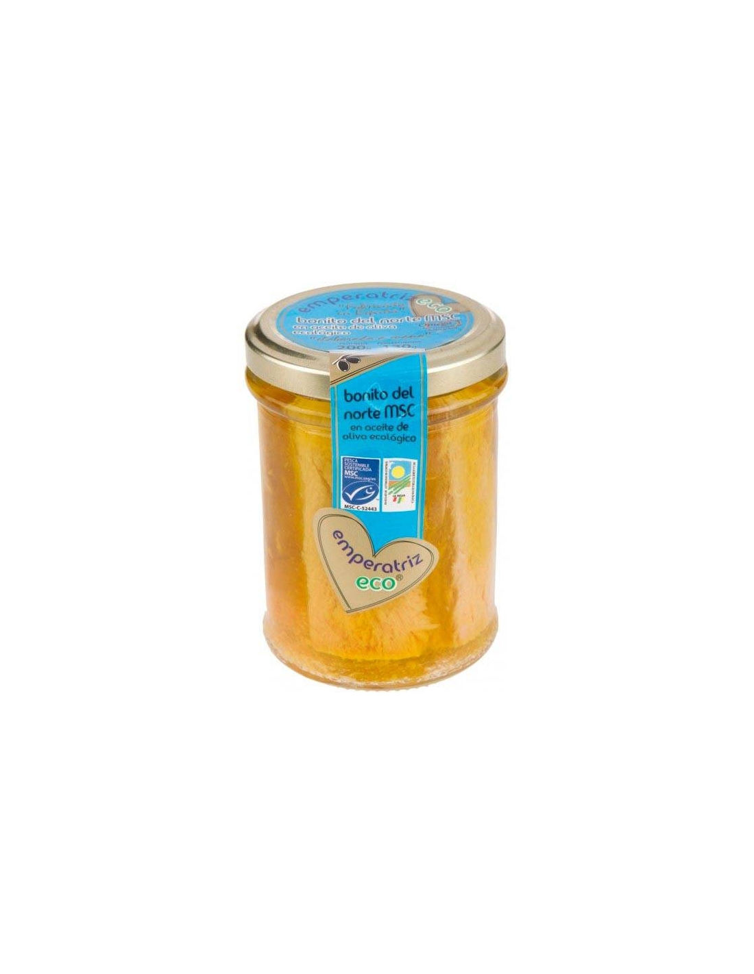 El Bonito del Norte más responsable, el bonito certificado MSC como pesca sostenible...En Conservas Emperatriz utilizamos una buena gestión de las materias primas para mantener los empleos, asegurar las poblaciones de bonitos para el futuro y ayudar a proteger el medioambiente marino.Las formas de captura utilizadas y los parámetros de elección de las piezas aseguran que la materia prima se encuentre siempre en su punto óptimo de textura y sabor, lo que se traduce en una conserva mucho más agradable en boca.IngredientesBonito del norte MSC, aceite de oliva virgen extra* y sal.