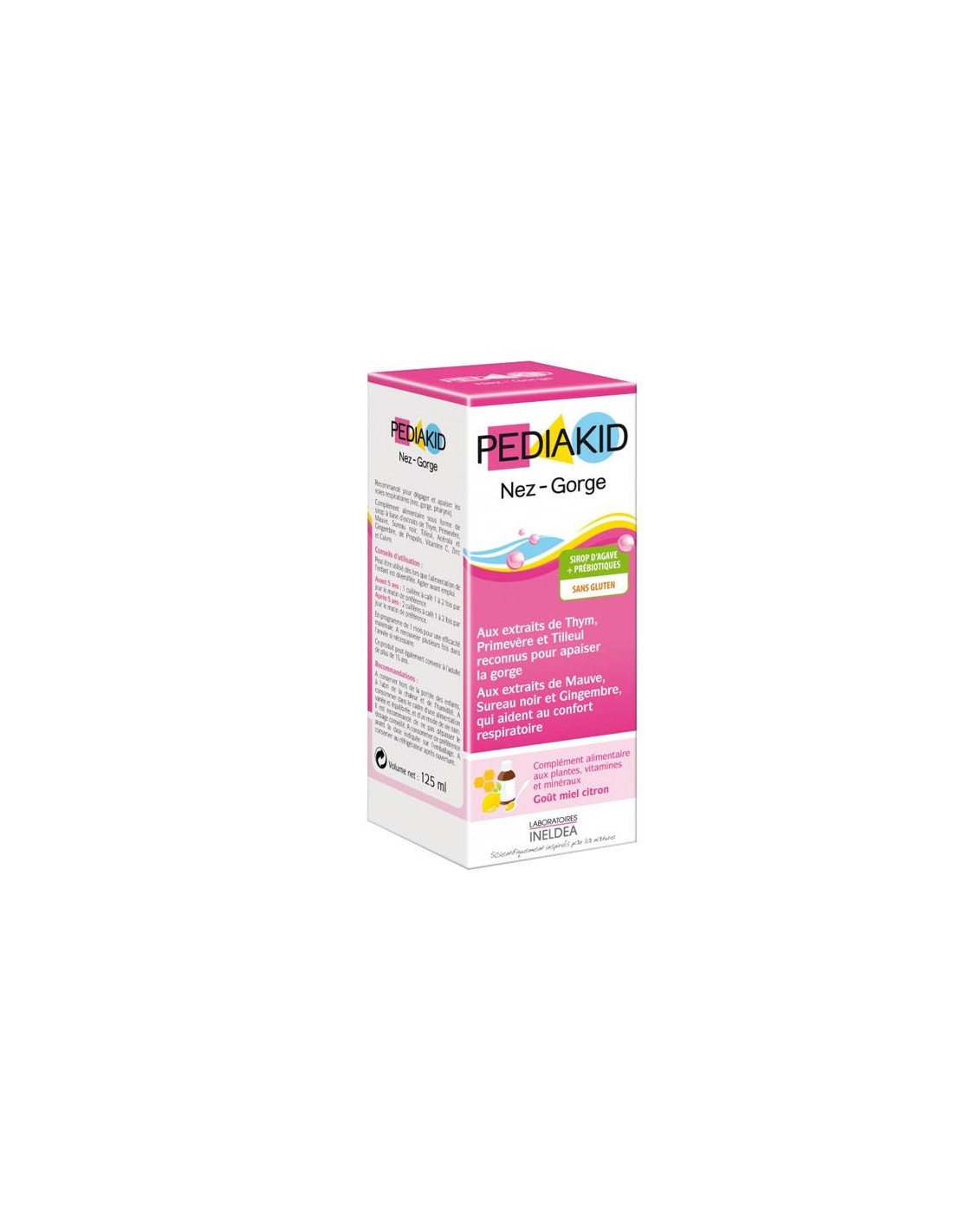 Jarabe natural para niños: 125 ml. Sabor Miel + LímónPediakid® Garganta Nariz utiliza la sinergia de los ingredientes activos naturales más eficaces para luchar contra los resfriados y aliviar el tracto respiratorio (nariz, garganta, pulmones ...), a la primera señal de congestión o irritación. Sus extractos de tomillo y Saúco Negro, son reconocido por su efecto expectorante, que se ven reforzado por La Primavera, Malva, Limón, Acerola, Jengibre, Propóleo, Vitamina C, Cobre y Zinc, que ayudan al cuerpo a combatir. Delicioso sabor a miel y limón concentrado natura.Puede ser usado desde que la alimentacion del niño está diversificada. Agitar antes de usar.Consejos de uso: Menos de 5 años: 1 cucharadita 1-2 veces al día, preferiblemente por la mañana. Mas de 5 años: 2 cucharaditas 1-2 veces al día, preferiblemente por la mañana. Recomendaciones:Consumir en programa de 30 días para eficacia máxima. Puede ser repetido varias veces en el año si es necesario.Mantener fuera del alcance de los niños, el calor y la humedad. Consumir en el marco de una dieta variada y equilibrada y un estilo de vida saludable. Se recomienda no exceder la dosis recomendada. Una vez abierto guardar refrigerado.