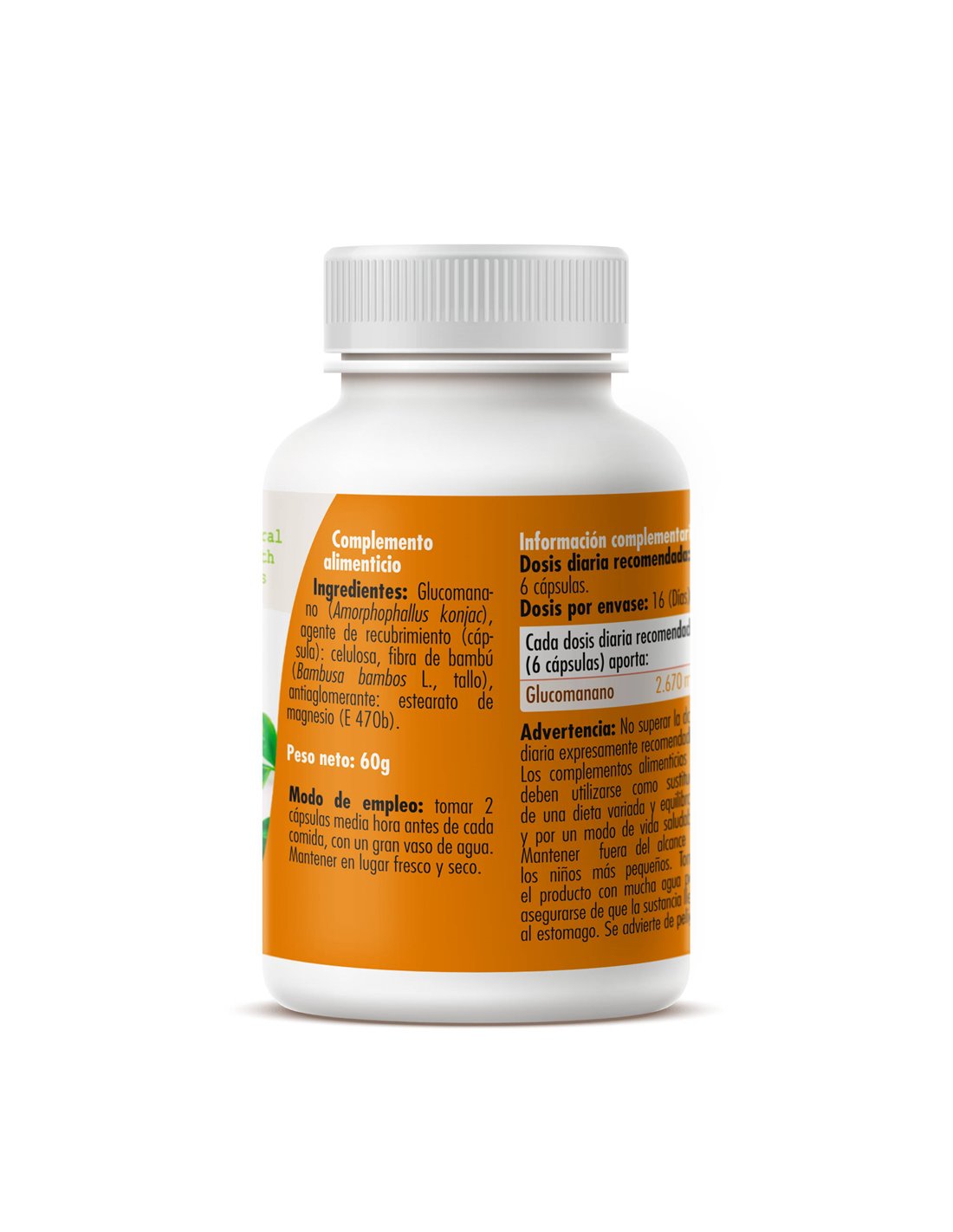 Complemento alimenticio a base de glucomanano, fibra natural que ayuda a controlar el apetito, reducir la absorción de grasas y azúcares, y favorecer la sensación de saciedad. Ideal para incluir en una dieta equilibrada.