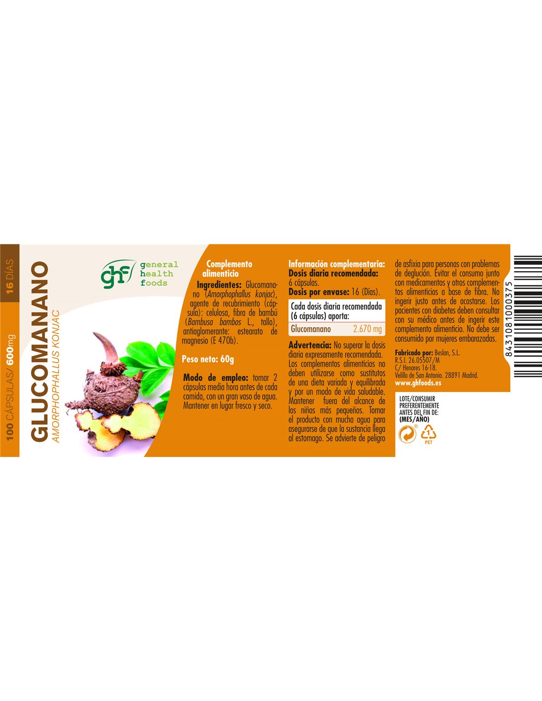 Glucomanano 600mg 100 Cápsulas GHF | Control de Apetito y sensación de saciedad | Fibra Konjac
