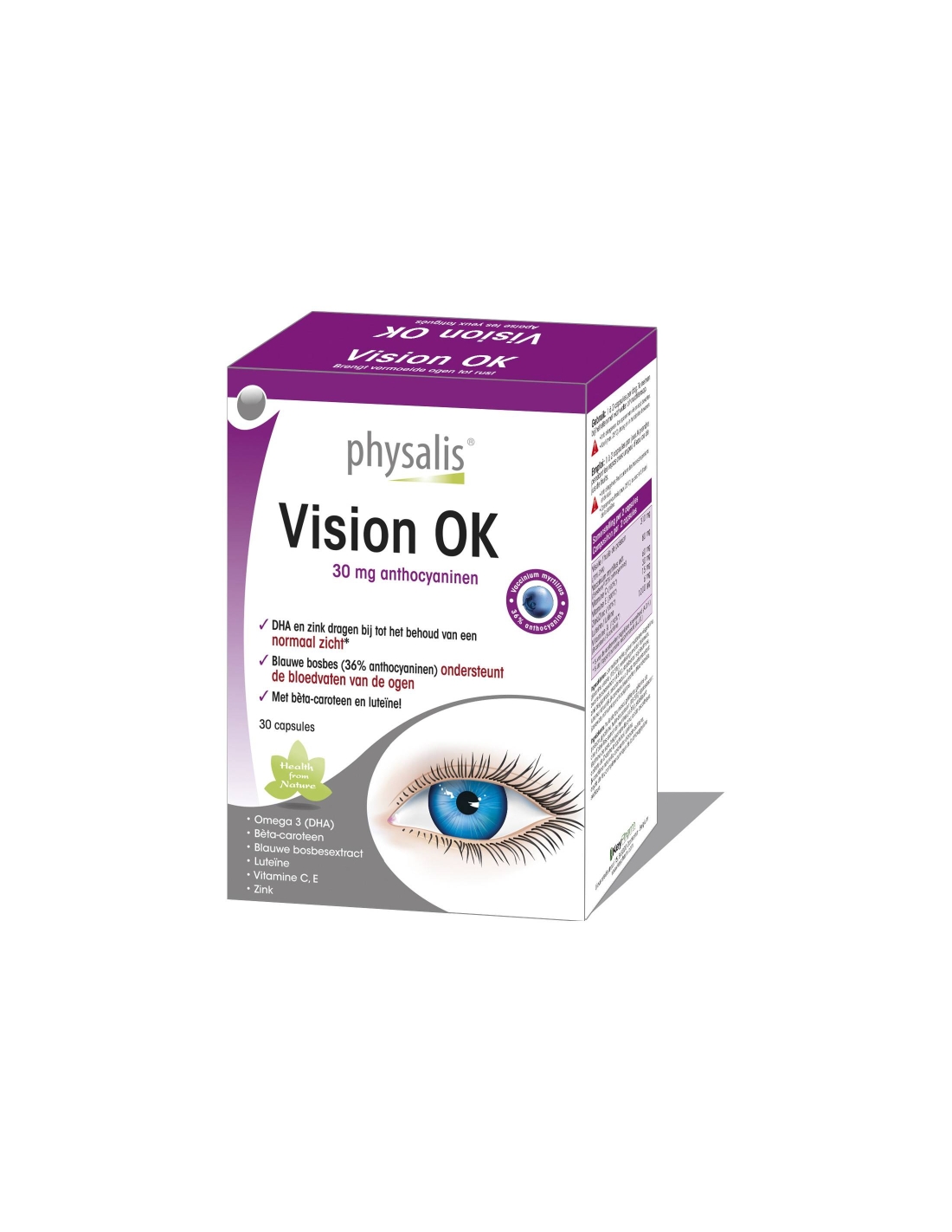 DescripciónComplemento alimenticio a base de plantas y nutrientesPhysalis Vision OK contiene zinc y aceite de pescado con un contenido de 70% del ácido graso omega-3 DHA que contribuyen al mantenimiento de una buena visión. Su acción es reforzada por la adición de beta caroteno natural, que se transforma en el organismo en vitamina A. Las vitaminas C y E ayudan a proteger las células contra los radicales libres. Contiene igualmente un extracto muy estudiado de mirtilo de alta calidad, con 36 % de antocianinas que participan en la mejora de la circulación de la sangre en los ojos, y luteína.