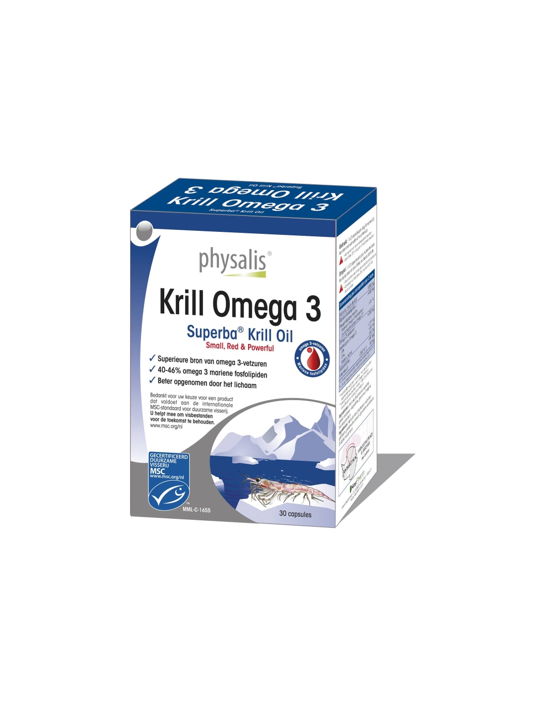 Complemento alimenticio a base de aceite de Krill de la antártida Physalis. El krill son pequeñas gambas que habitan en aguas frías, una especie de zooplancton marino. El aceite de krill Physalis se extrae de la Euphausia superba, es un aciete muy rico en ácidos grasos omega 3 EPA y DHA. Los omega 3 del aceite de krill están presentes en forma de fosfolípidos que son mucho mejor asimilados por el organismo. Además contiene astaxantina, ácidos grasos.