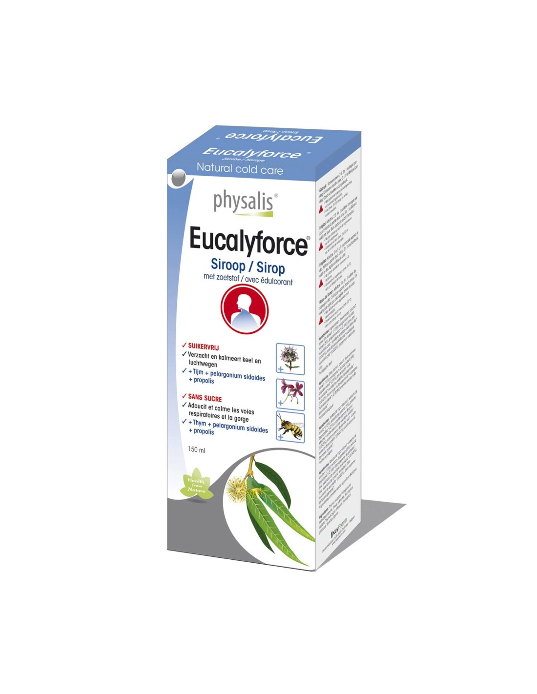 Complemento alimenticio a base de plantasHeladas, viento, lluvia, contaminación,... Nuestras vías respiratorias están sometidas a menudo a duras pruebas. Physalis jarabe Eucalyforce ejerce una acción calmante y tranquilizante sobre las vías respiratorias y la garganta. Este jarabe 100% natural contiene una combinación de extractos de plantas (tomillo, geranio) y de aceites esenciales (eucalipto, menta, pino y tomillo) que facilitan la respiración.