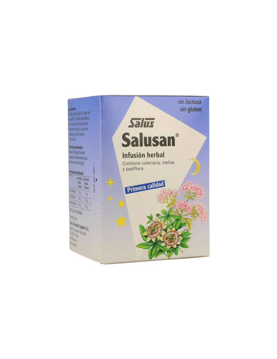 La infusión Salusan está elaborada a base de valeriana, melisa y pasiflora que contribuyen a la relajación y ayudan a mantener un sueño natural. Además contiene menta, manzanilla, regaliz, anís y escaramujo.