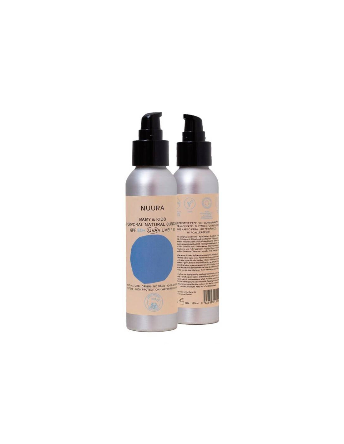 La crema solar NUURA tiene un factor 50 de protección solar y cubre de forma homogénea la piel gracias a los filtros minerales. Tiene una textura fluida para aplicar en todo el cuerpo consiguiendo una excelente adherencia. Ideal para niños y bebés, su fórmula específica la es especial para pieles sensibles, reactivas y blancas.
