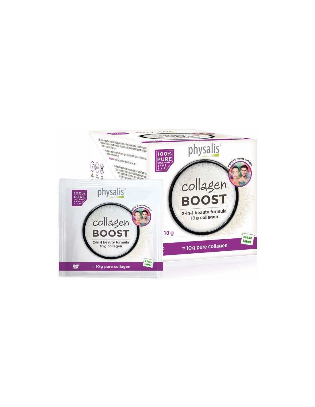 Physalis Collagen Boost aporta colágeno de tipo I y tipo II. El colágeno es una molécula del tejido conjuntivo. El colágeno de tipo I se encuentra en la piel, huesos, tendones y ligamentos. El colágeno de tipo II proporciona su estructura elástica al cartílago de las articulaciones.
