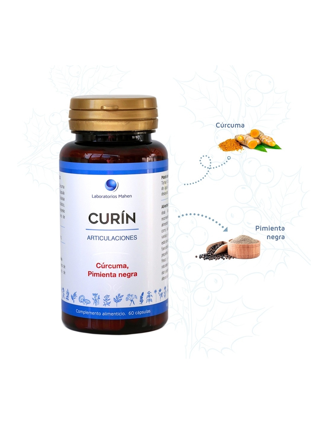 Curin es un complemento alimenticio que combina la cúrcuma y la pimienta negra para brindar una fórmula natural con acción antinflamatoria.