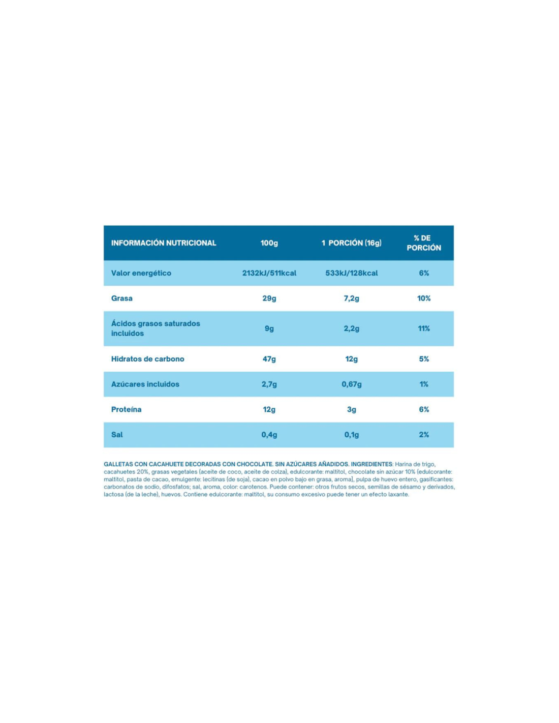 Harina de trigo, cacahuetes 20%, grasas vegetales (aceite de coco, aceite de colza), edulcorante: maltitoles; chocolate sin azúcar 10% (edulcorante: maltitoles; pasta de cacao, emulgente: lecitinas (de soya); cacao en polvo bajo en grasa, aroma], pulpa de huevo entero, gasificantes: carbonatos de sodio; difosfatos; sal, aroma, color: carotenos. El producto puede contener: otros frutos secos, leche, semillas de sésamo y derivados.
